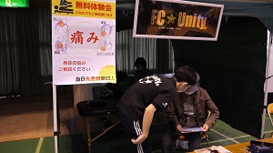 | FC☆Unityのブースはチームトレーナーによる「無料施術体験」を企画し沢山の人達とふれあう事が出来ました。 |